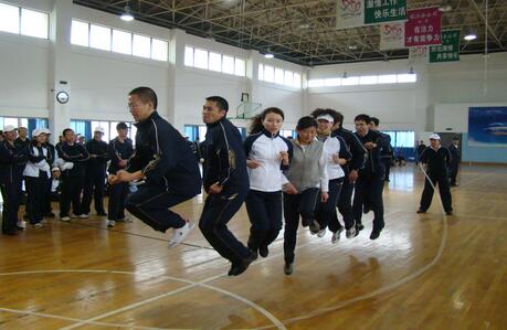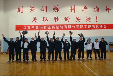 终于轮到最让人期待的集体比赛项目了;十人一组的集体跳绳,是所有项目中最能体现一个团队协作精神的项目。在规定的3分钟内,绕绳的两人和跳绳的八人必须步伐合拍,节奏一致。第一个上场比赛的是第一代表队(第一工厂),赛前其他的参赛队员多多少少都会在场边进行热身练习,只有这个第一代表队列队旁观,仿佛吃了定心丸,个个胸有成竹的样子。按照比赛规则,正式比赛前允许有两次试跳,第一代表队的选手开始试跳了;第一次,魏引娟的鞋子差点被“引”了出去…第二次,好像又是田蓉踩了后面胡光荣的脚…两次试跳,一工厂的成绩并不理想,场边已有人窃窃私语“牛什么,谁让他们刚才不练习,估计前三都进不去!”,但是场上所有一工厂队员的眼神依然十分淡定。随着裁判员的倒数三二一,比赛开始了!“1,2,3,4…..119、120、121”停!天哪,没想到第一个上场的第一代表队居然在三分钟内整整跳了121下!这个成绩也最终让他们站上了集体跳绳比赛冠军的领奖台,并比第二名整整领先了31个!赛后心有不甘的其他代表队成员向领队卢正军请教,为何他们不用练习就能如此完美发挥?答曰“谁说我们不练?!我们所有参赛队员在比赛前十天连吃午饭都是手拉手蹦着去的……”