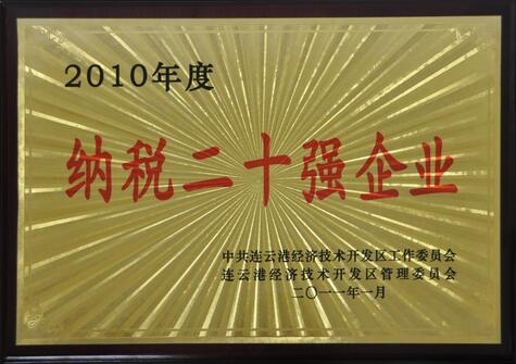 近日,在连云区政府举行的开发区企业纳税大户表彰会上,我公司被开发区管理委员会授予 “2010年度纳税20强企业”的光荣称号并颁发奖金。2010年度,我公司在公司领导及全体员工的共同努力下,销售额和税收均创历史最高。