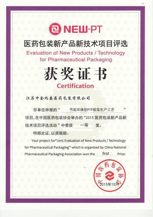 近日,在医药包装新产品新技术获奖项目发布会上,我公司“节能环保型PTP铝箔生产工艺”荣获中国医药包装协会颁发的2015医药包装新产品新技术项目评选一等奖。