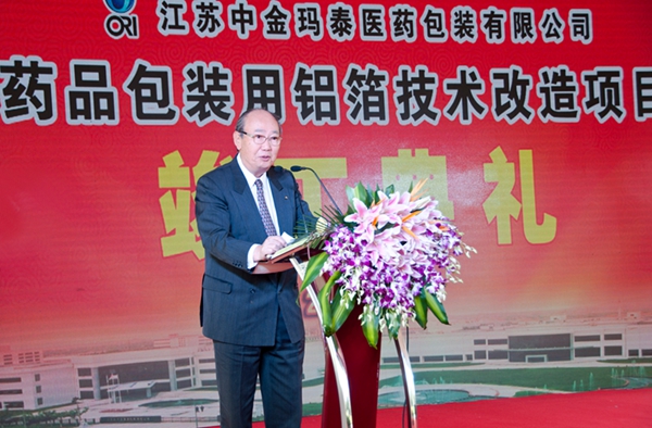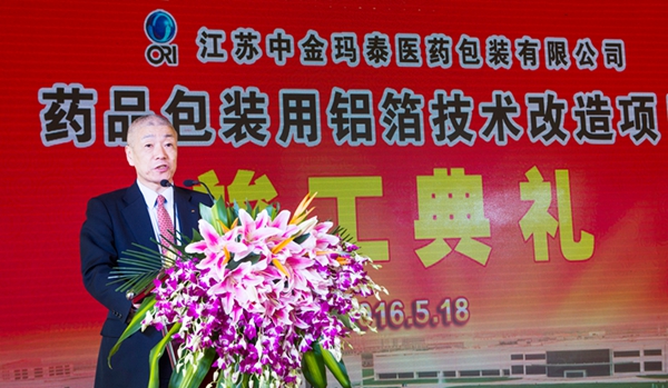 公司樱井董事长首先作开场致辞,他代表中金玛泰向莅临今天庆典活动的各位来宾表示热烈的欢迎,向长期以来关心和支持中金玛泰事业发展的各级领导、各界朋友、所有客户以及设备、原材供应商表示衷心的感谢。向为项目建设付出辛勤劳动的各建设单位和全体工作人员表示亲切的慰问。他说,中金玛泰药用包装铝箔技改项目自2015年7月开工建设以来,历时10个月,克服了各种不利因素的影响,如期建成了一座国内领先的环保、节能示范型工厂,新工厂引进国内最先进的生产设备,确保为客户提供安全、优质的产品,同时配以有机溶剂尾气回收装置,在提升企业经济效益的同时,进一步提升社会效益。致辞中樱井董事长也指出,今年是公司成立27周年,自创业以来,中金玛泰全体员工始终保持着要守护医药品安全的崇高使命,认真工作。他相信伴随着新工厂的竣工投产,中金玛泰医药包装事业必将进入一个新的发展阶段。他也衷心地希望各级领导、各位嘉宾能够继续关注中金玛泰的成长与发展,并一如既往的给予指导与支持。