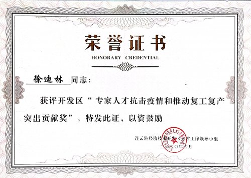 近日,连云港经济技术开发区召开全区人才工作会议,会上对人才工作先进单位、先进个人,以及在抗击新冠肺炎疫情和推动复工复产工作中做出突出贡献的专家人才进行了表彰,我公司生产总监徐迪林被授予“专家人才抗击疫情和推动复工复产突出贡献奖”。