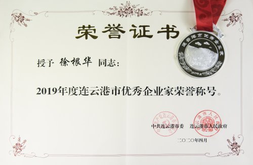 近日,连云港市委市政府召开2019年度全市“高质发展、后发先至”总结表彰大会。会议宣读了连云港市市委、市政府《关于表彰2019年度连云港市功勋企业家、优秀企业家和纳税十强企业、科技创新二十强企业的决定》,并举行颁奖仪式。我公司总经理徐根华再次荣获“连云港市优秀企业家”荣誉称号,公司也被评为“市科技创新二十强企业”。