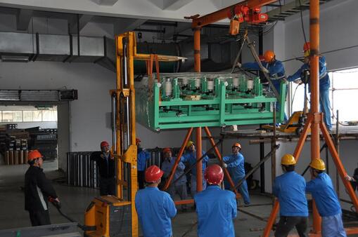 4月1日上午,在公司二工厂的厂房外围,一台庞大的起重机正吊起一台设备组件往厂房二楼窗口支架的方向缓缓移动,在现场施工负责人的指挥下,设备稳稳地降落在支架的平台上,而此时在9米高支架平台处的设备部经理朱永希则带领其他人员将设备缓缓地往厂房内的平台处移动……