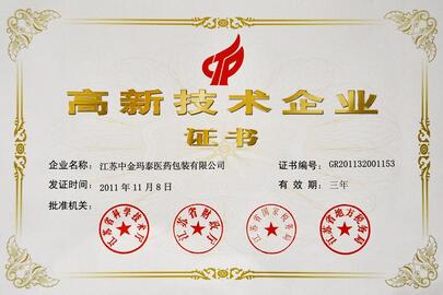 高新技术企业的通过,标志着公司的科技创新能力再上一个新的台阶,对公司今后的生产、经营将起到很大的推动作用。同时也增强了中金玛泰的市场竞争力,增加企业的经济效益,也充分肯定了中金玛泰作为医药包装领先企业所做出的创新价值。中金玛泰一直以来坚持走科技创新道路,先后有4个项目获得省科技进步奖,“PTP彩箔”、“纸/铝/塑复合膜”、“聚合物锂离子电池芯内包装成型材料”、“非PVC大输液膜 ”等多个产品成为国家级重点新产品。近三年来,企业获得国家发明专利1项、实用新型6项。“中金”品牌被评为国家优秀包装品牌,“水性PTP铝箔”项目获得国家优秀创新奖。2010年高新技术产品收入达到2.4亿元,占销售收入77%。科技创新为企业的发展做出了巨大的贡献。