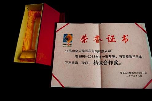 中金玛泰公司凭借优秀的企业品牌,过硬的产品质量、完善的售后服务体系以及与葵花药业多年良好合作的关系,在众多的葵花合作商中脱颖而出,喜获“十五周年精诚合作奖”,在铝箔和复合膜类供应商中获此殊荣仅我公司一家。