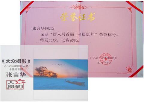 近日,我公司市场推广部张言华荣获江苏省企业摄影家协会颁发的“影人网”首届十佳摄影师称号。张言华利用业余时间从事摄影创作,短短时间内取得了令人瞩目的成绩,其现为中国摄影家协会会员,中国艺术摄影学会会员,大众摄影2012年网络十佳摄影师,近年来有近30部作品在《大众摄影》《中国摄影杂志》《中国摄影报》等国家级期刊获奖发表,代表作有《北国风光》、《都不理我》、《秋》、《春花似梦》、《岁月》、《雨季》、《金色的乐章》、《冰城》、《阳光女孩》、《曾经沧海》、《广场魅影》、《早市》、《梦里雪乡》、《雨中漫步》、《冬眠》、《待》、《老道外》、《市场》、《梦幻荷塘》、《海边》、《雾之韵》、《雪域晨光》、《松花江边》、《海滨浪漫曲》等。其中《炫冰之魅》系列作品刊登在中国摄影报2014年1月14日佳作栏目。