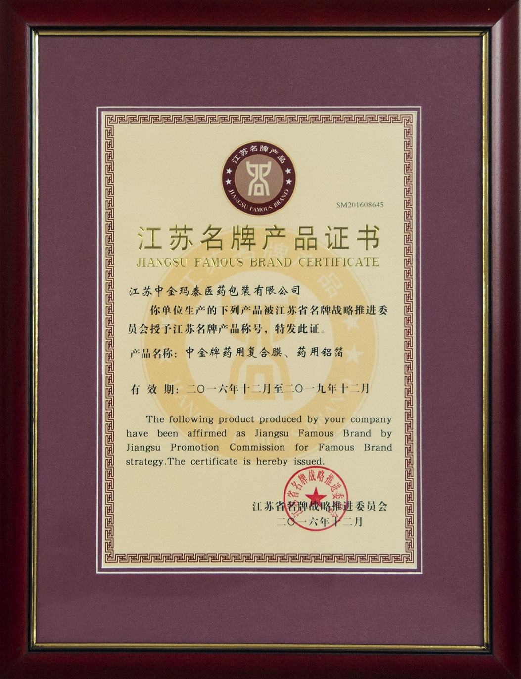 近日,在江苏省名牌战略推进委员会公布的2016年度江苏名牌产品名单中,我公司两大主营产品,中金牌药用复合膜、药用铝箔荣获江苏省名牌产品称号。