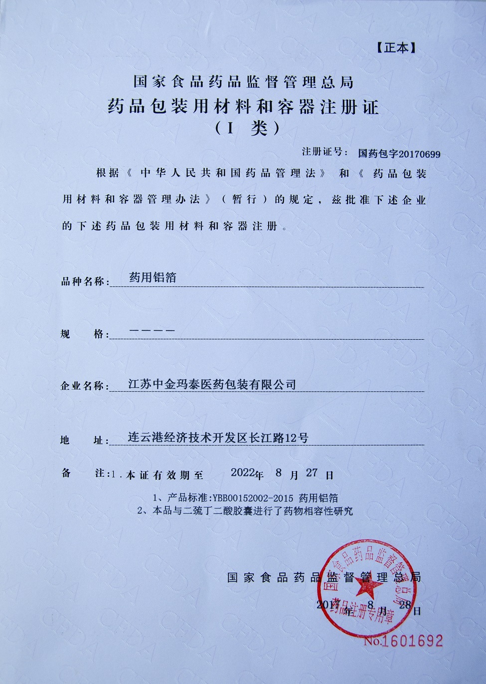 近日,中金玛泰PTP新工厂药用铝箔产品取得由国家食品药品监督管理总局颁发的《药品包装用材料和容器注册证》(I 类),注册证号: 国药包字20170699,注册证有效期至2022年8月27日。