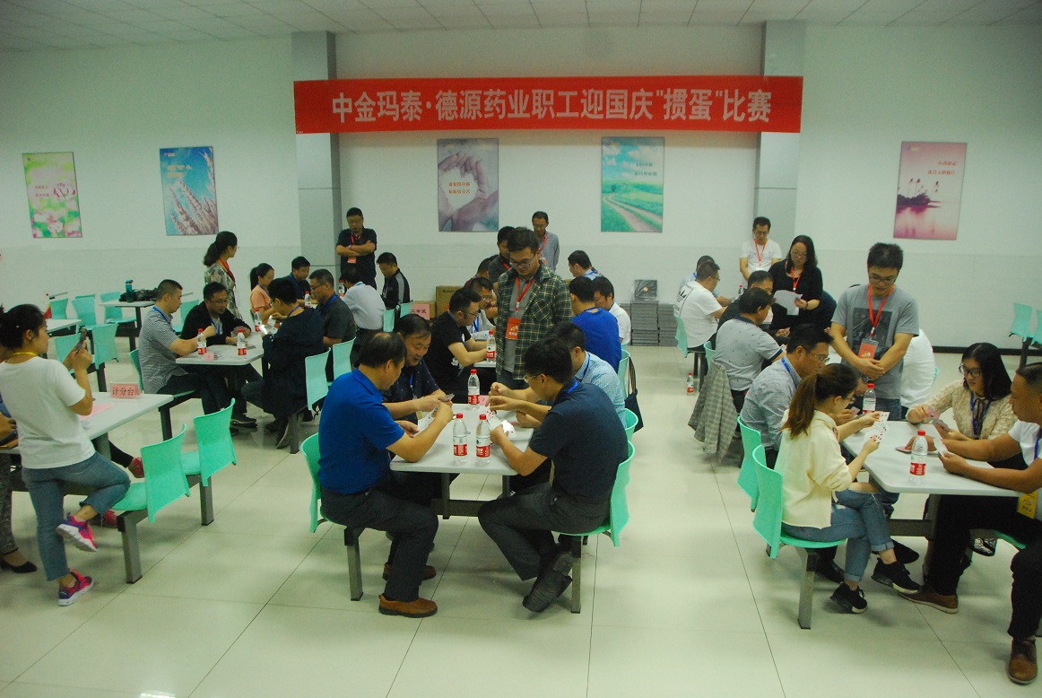 为庆祝中华人民共和国成立69周年,9月29日,中金玛泰·德源药业职工迎国庆“掼蛋”比赛在德源药业举行。本次活动双方各选派出8组选手参加了比赛。