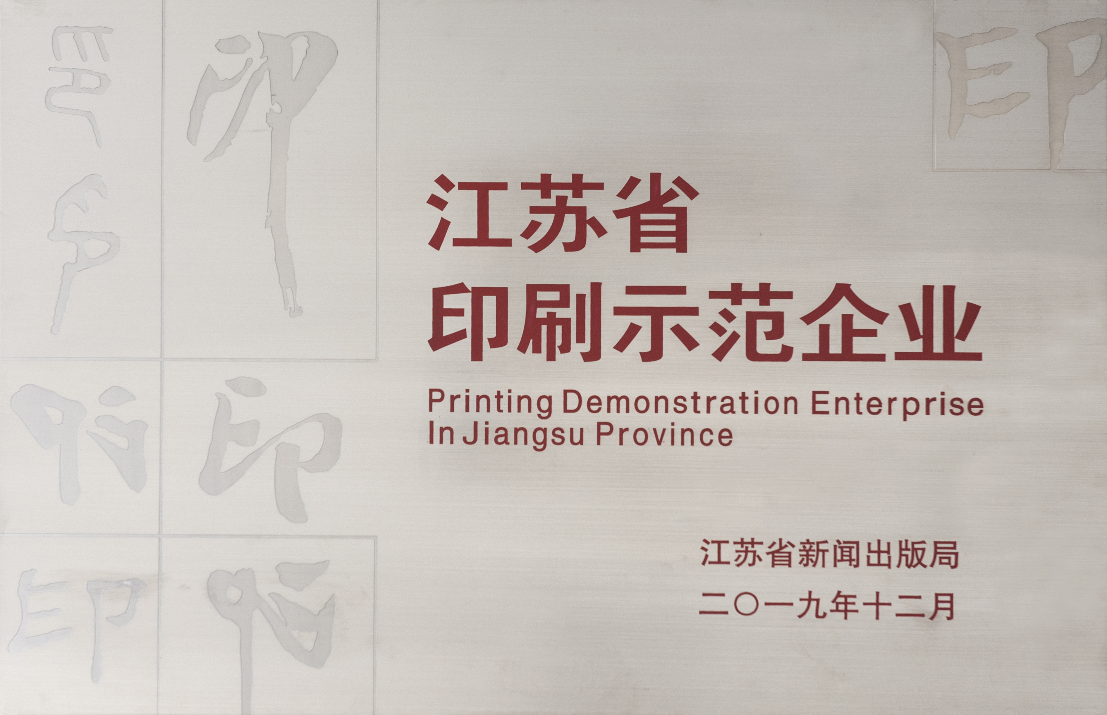 近日,从江苏省新闻出版局获悉,经过企业组织申报、审核勘验、公示认定、集中授牌四个环节,我公司被江苏省新闻出版局授予2019年度“江苏省印刷示范企业”荣誉称号。