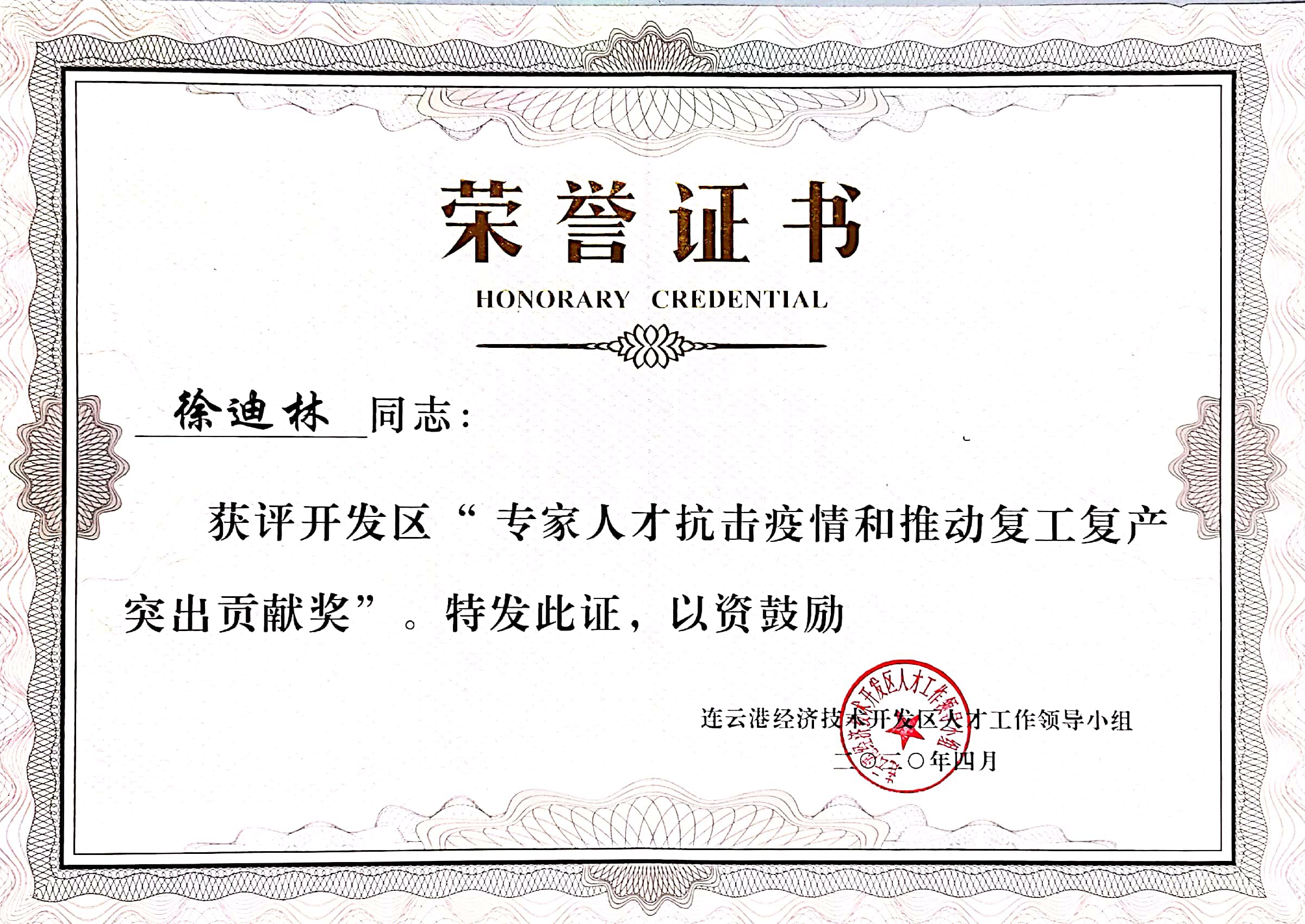 近日,连云港经济技术开发区召开全区人才工作会议,会上对人才工作先进单位、先进个人,以及在抗击新冠肺炎疫情和推动复工复产工作中做出突出贡献的专家人才进行了表彰,我公司生产总监徐迪林被授予“专家人才抗击疫情和推动复工复产突出贡献奖”。