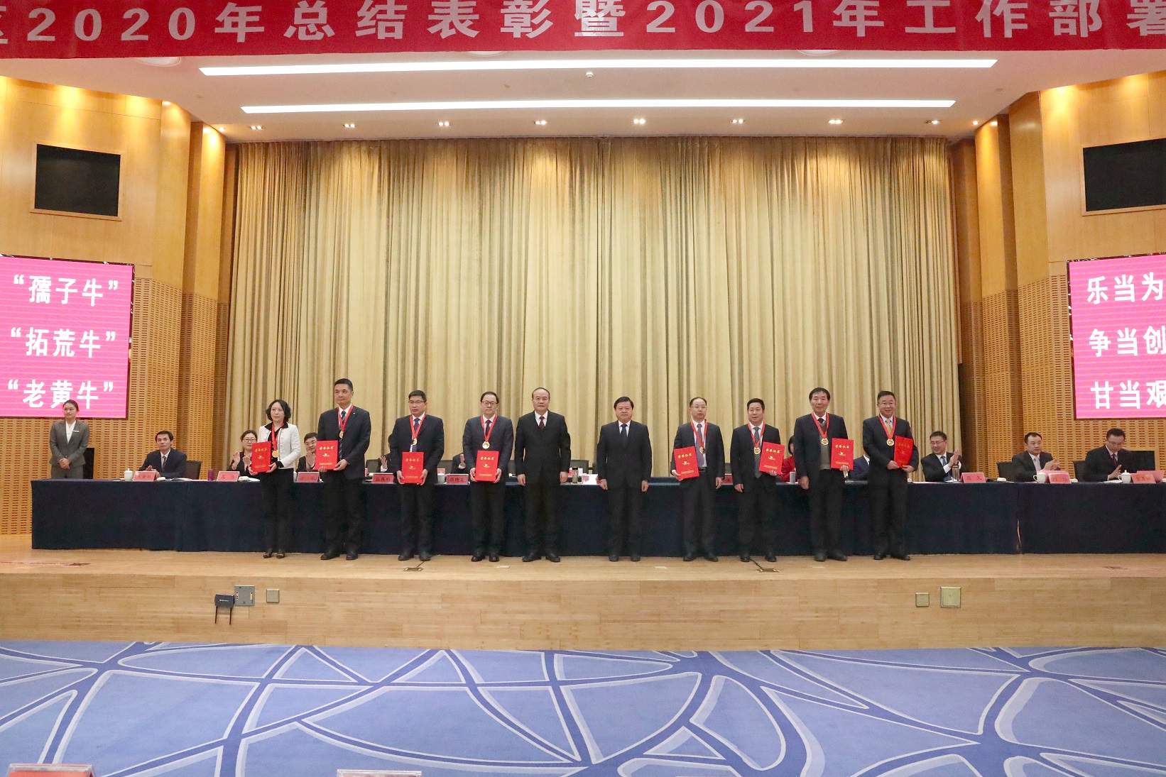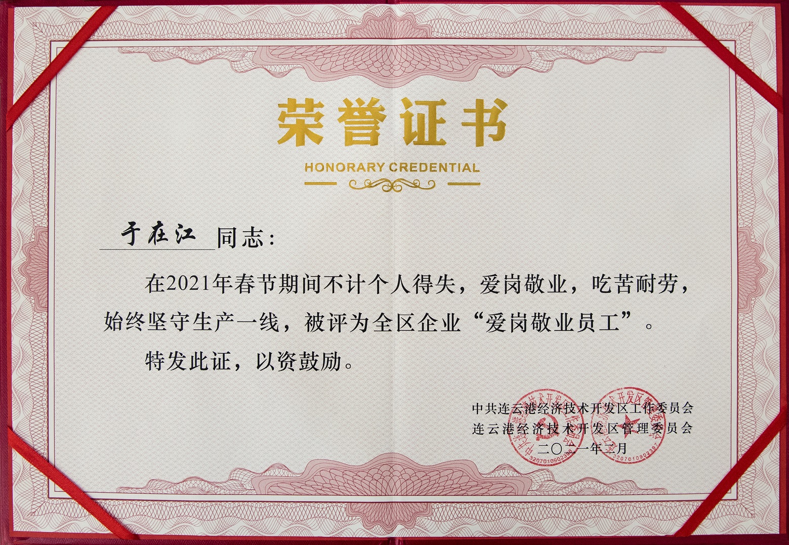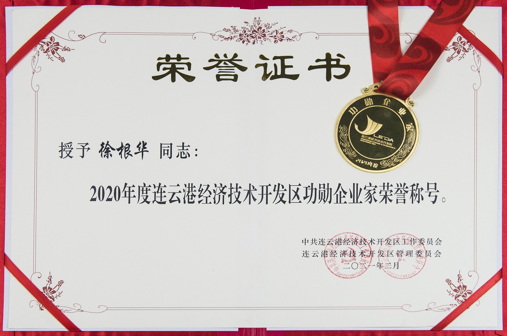 表彰会上,我公司总经理徐根华荣获“2020年度连云港经济技术开发区功勋企业家”荣誉称号,“中金工匠”于在江被评为全区企业“爱岗敬业员工”荣誉称号。